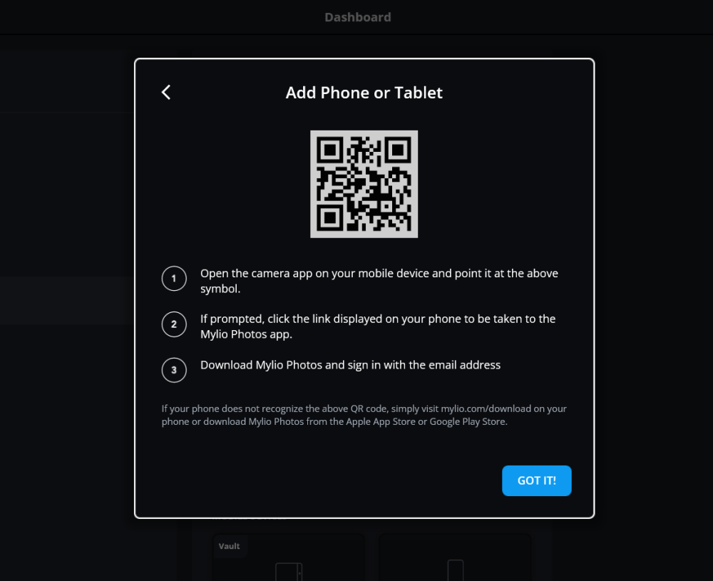 - Verwenden Sie die Kamera Ihres Mobilgeräts, um den QR-Code zu scannen. Dadurch werden Sie automatisch zum iOS App Store oder Google Play Store weitergeleitet, um die Mylio Photos App herunterzuladen.