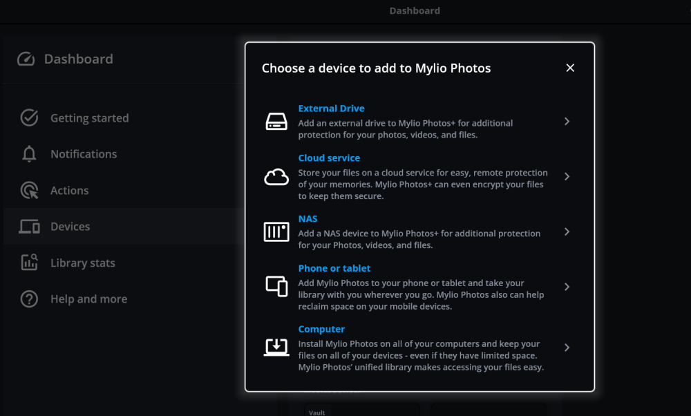 - Hinzufügen von Geräten zu Mylio Photos+ fügt Orte hinzu, an denen Ihre Fotos gespeichert werden. Geräte können zum Anschauen dienen – wie Ihr Laptop oder Telefon – oder zum Speichern – wie eine externe Festplatte oder ein Cloud-Dienst. Geräte wie Desktop-Computer mit viel Speicherkapazität können zum Betrachten und Speichern verwendet werden.