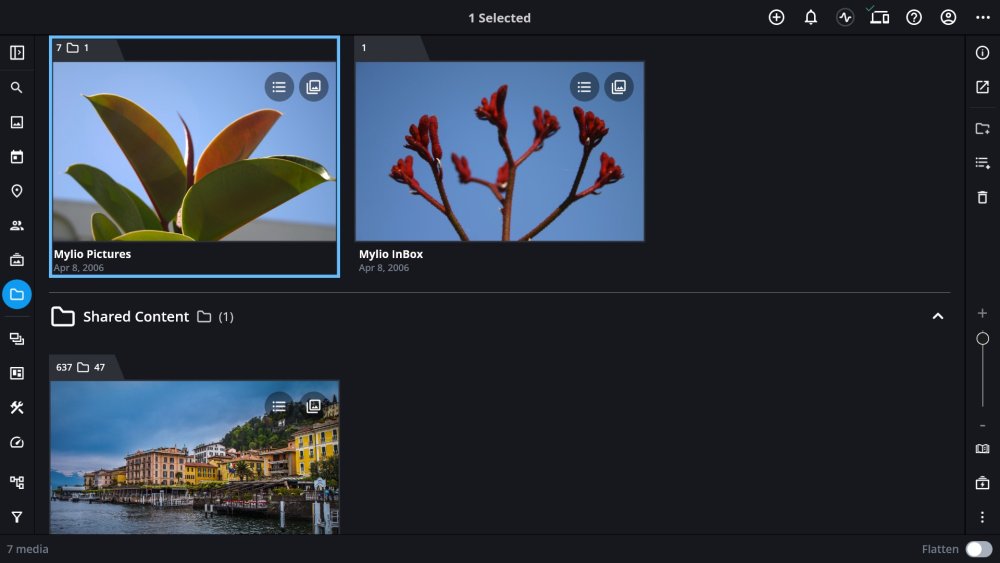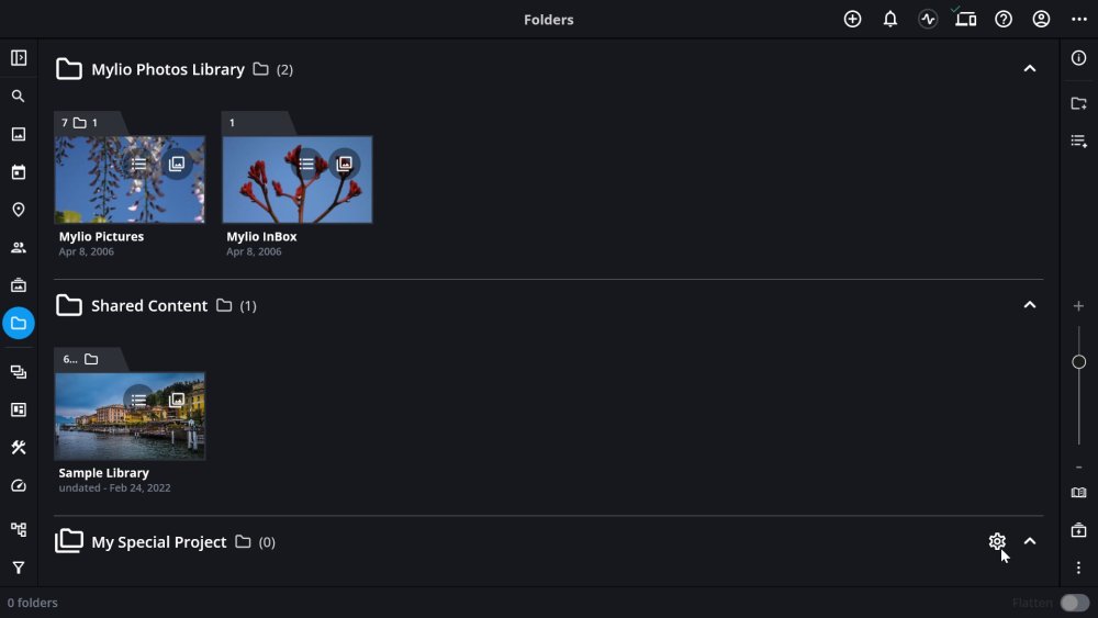 The Folders View in Mylio Photos can be customized to suit your organizational preferences and visual style. By default, folders are grouped into predefined Sections, such as the Mylio Photos Library, Shared Content, Social Media, Apple & Android Photos, and Devices with Linked Folders.