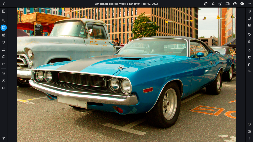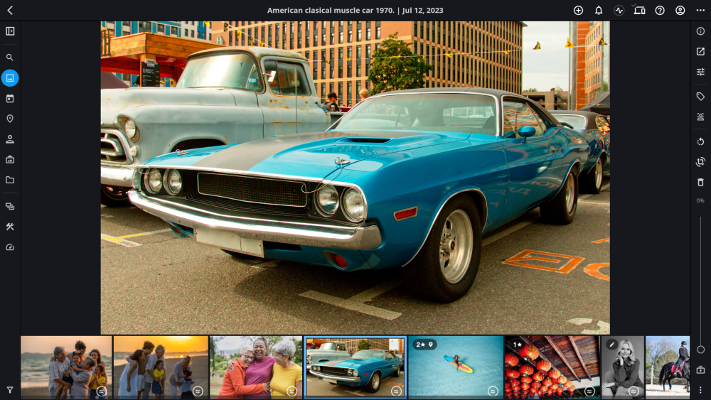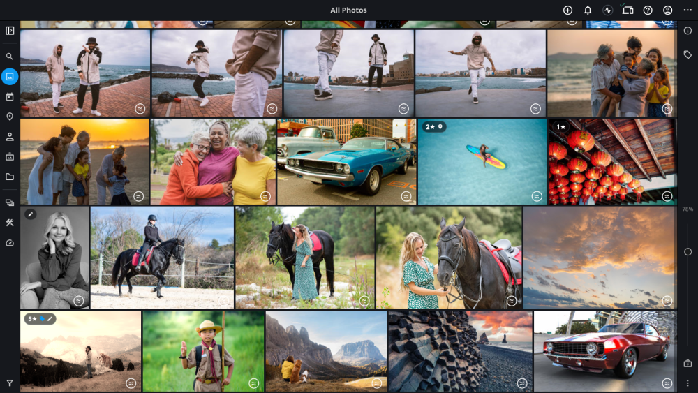Mit dem Bildfenster können Sie Ihre Medien in Mylio Photos anzeigen. Wenn Sie Mylio Photos öffnen, werden Ihre Medien in der Gitteransicht angezeigt. Mit einem Doppelklick (oder Tippen) gelangen Sie in die Einzelfoto-Ansicht, um sich jedes Foto genauer anzusehen. In der Einzelfotoansicht können Sie den Filmstreifen am unteren Rand des Bildschirms ein- oder ausblenden. Mit dem Filmstreifen können Sie andere Bilder im selben Container (z. B. Ordner, Album, Person usw.) sehen, was das Durchsuchen Ihrer Medien erleichtert.