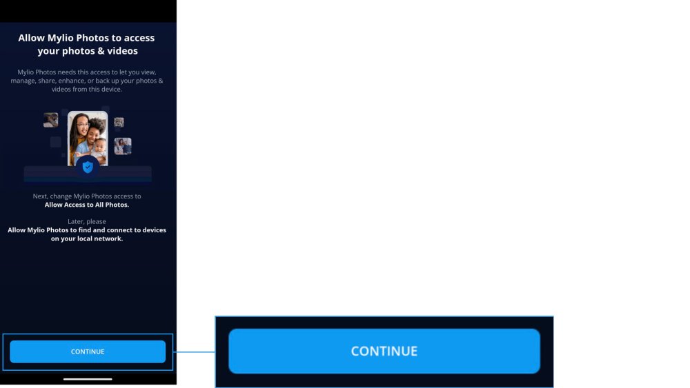 - Um Mylio Photos den Zugriff auf die Fotos und Videos auf Ihrem Smartphone oder Tablet zu ermöglichen, tippen Sie auf Fortfahren.