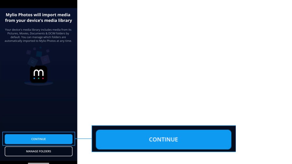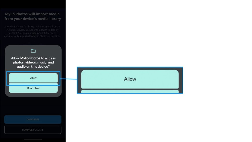 - Android-Benutzer: Tippen Sie auf Fortfahren, um Mylio Photos den Zugriff auf alle Medien in Ihrer Medienbibliothek zu ermöglichen, oder tippen Sie auf Ordner verwalten, um einen bestimmten Ordner auszuwählen.