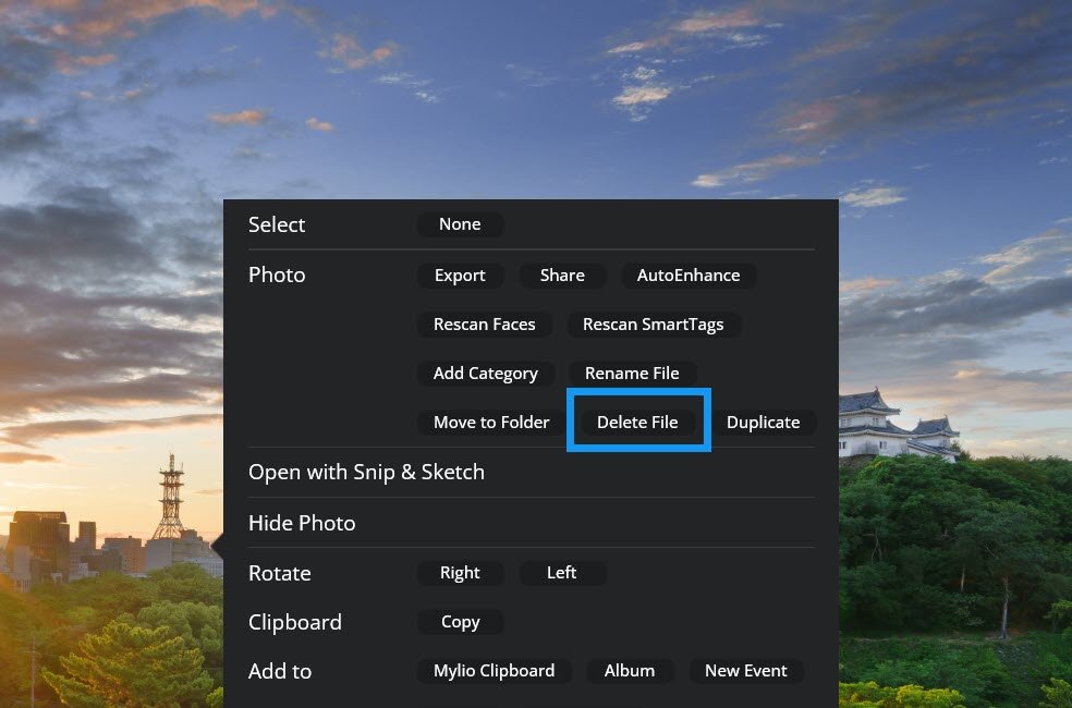 in der rechten Seitenleiste, um auf das Menü *Aktionen zuzugreifen und wählen Sie Foto > Datei(en) löschen, um die Datei(en) dauerhaft aus Ihrer Mylio Photos Bibliothek und Ihrem Dateisystem zu löschen.