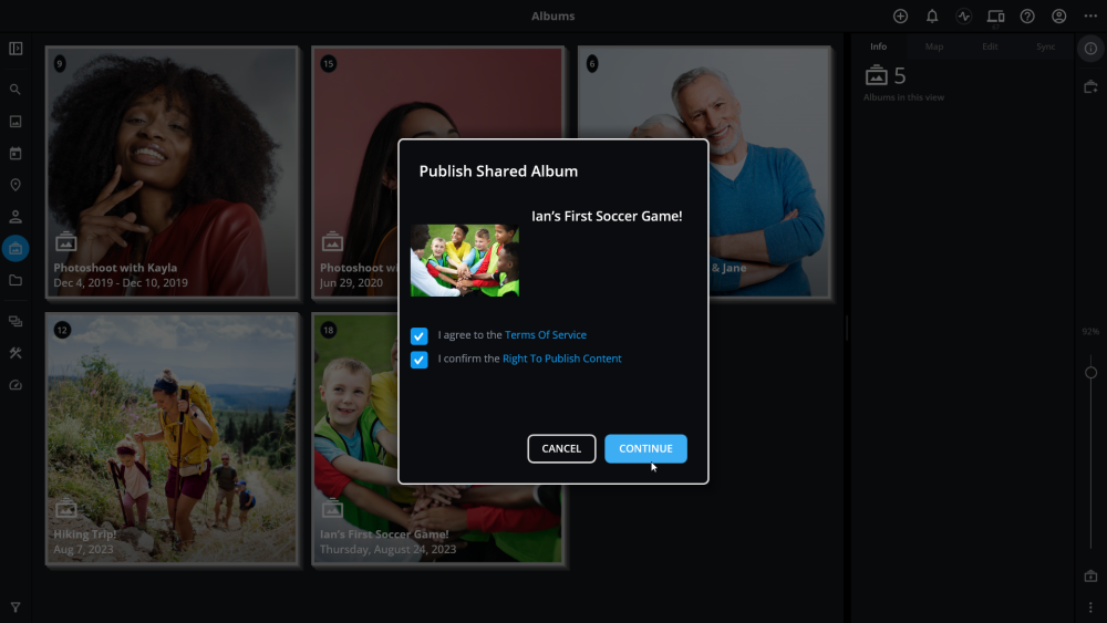 - Wenn Sie fertig sind, klicken Sie auf die Schaltfläche Freigeben. Das Hochladen Ihrer Fotos in Ihr gemeinsames Online-Album kann einige Augenblicke dauern. Bitte beenden Sie Mylio Photos nicht, bevor der Upload abgeschlossen ist.