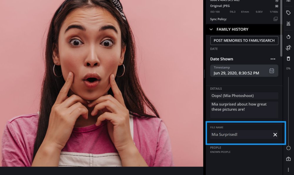 Datei- und Ordnernamen sind in Mylio Photos durchsuchbar, daher ist es eine gute Idee, beschreibende Namen zu verwenden, damit Sie Dinge schnell finden. Fotos, Videos und Dokumente können “beim Import umbenannt” werden: https://manual.mylio.com/24.3/de/topic/add-metadata-on-import, als Gruppe oder einzeln umbenannt werden. Ordner können auch innerhalb von Mylio Photos umbenannt werden.