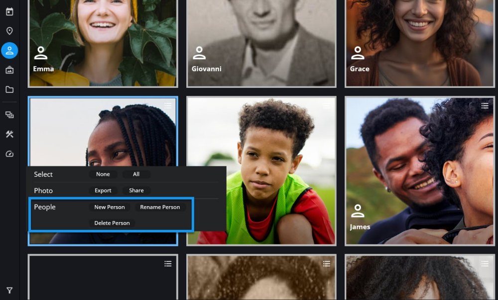 Ganz gleich, ob Sie einen Schreibfehler korrigieren, einen Spitznamen in einen Vornamen umwandeln oder einen Namen aufgrund eines anderen Lebensereignisses, wie z. B. einer Heirat, ändern möchten – mit Mylio Photos ist es ganz einfach, die Namen der von Ihnen identifizierten und markierten Personen zu aktualisieren oder zu ändern.