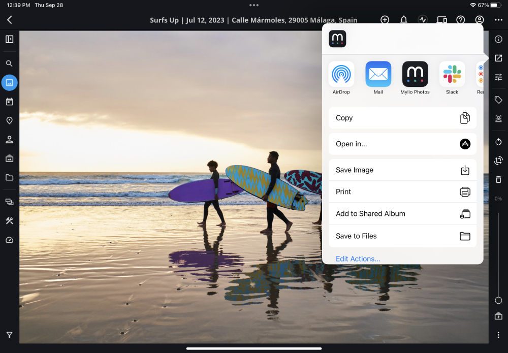- Drucken – Senden Sie Ihr(e) Foto(s) zum Drucken an einen AirPrint-fähigen Drucker in der Nähe. Klicken Sie hier, um mehr über das Drucken von Mylio Photos zu erfahren.
