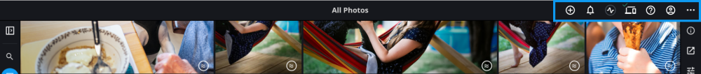 Die Oberste App-Leiste enthält mehrere Symbole, die auf einige der wichtigsten Werkzeuge und Funktionen von Mylio Photos verweisen.