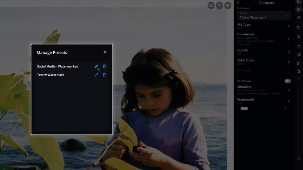 | Preset | File Type | Dimensions | Quality | Color Space | Bit Depth | SafeShare | Metadata | Watermark |