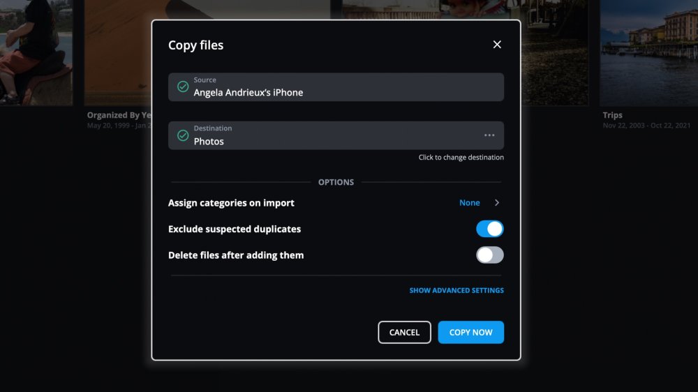- Exclude suspected duplicate files is toggled ON by default. This will skip copying images already added to your Mylio Photos Library.