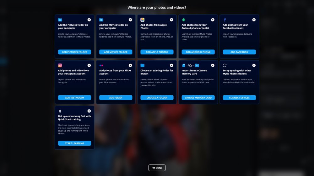 The first time you launch Mylio Photos, you’ll be prompted to Start Adding Photos and Videos. This will open the Guided Import checklist that suggests different media sources you may want to import into your Mylio Photos Library. Designed to help new users consolidate their many sources of photos, videos, and documents into a single library, Guided Import makes it easier to import from all your many sources.