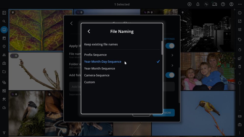 - Prefix-Sequence, Year-Month-Day-Sequence, Year-Month-Sequence, Camera-Sequence, or Custom.