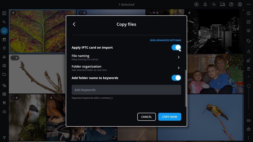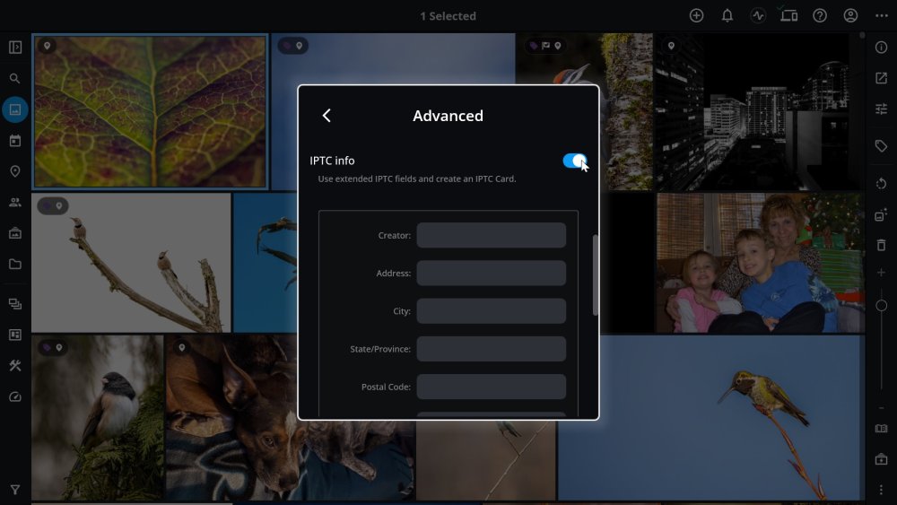 By default, adding an IPTC Card on Import is hidden but can be enabled under Settings > Advanced. Click here to learn how to set up an IPTC card with your creator and copyright information.
