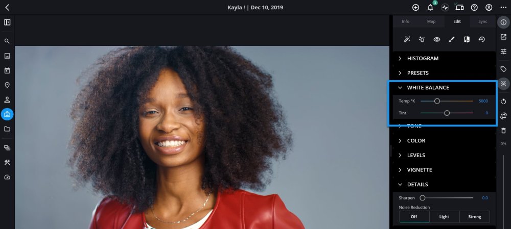 - On a computer or tablet, adjust the Temp °K and Tint sliders to remove any unnatural color cast.