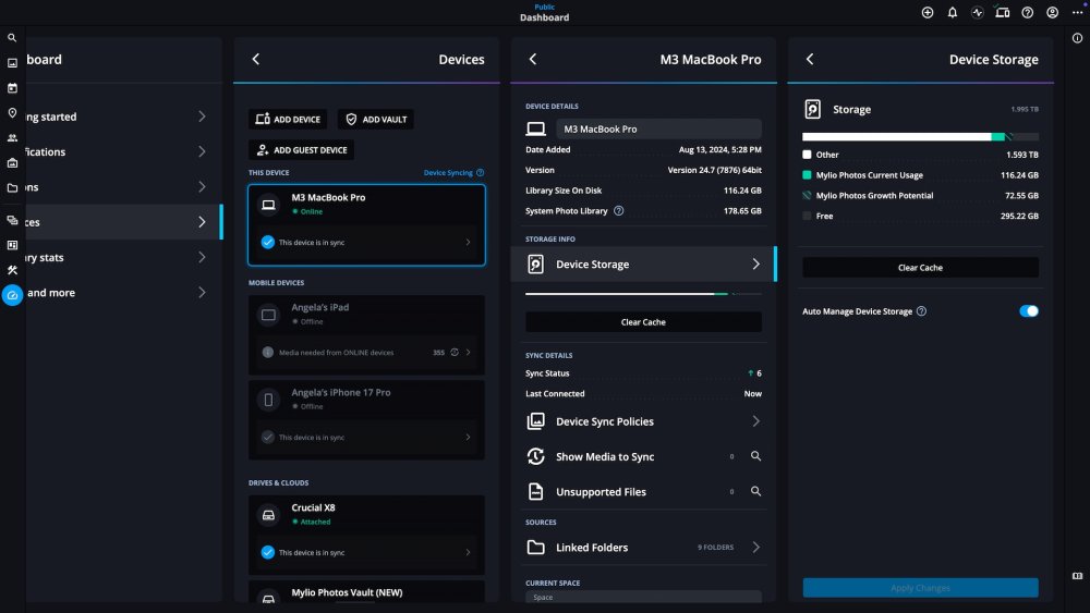 By default, Mylio Photos+ will automatically manage available disk space on any device that is not configured as a Vault. The application automatically determines the amount of free space to leave on a device, but this amount can be customized to fit your device storage needs.