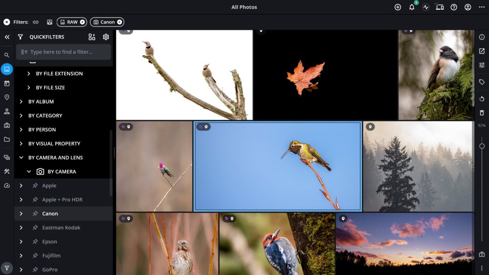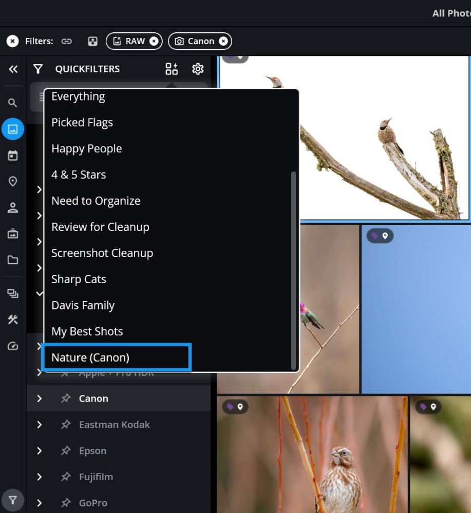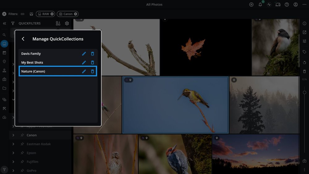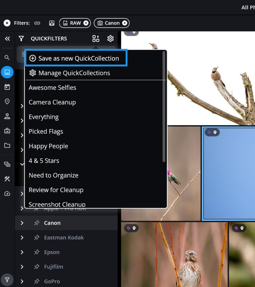 A QuickCollection is a saved group of QuickFilters that automatically gather and display specific photos based on your set criteria. For example, you can create a QuickCollection that contains your 5-star images with the SmartTag Bird, or that contain only your Raw photos photographed with your Canon camera that were captured in the last year.