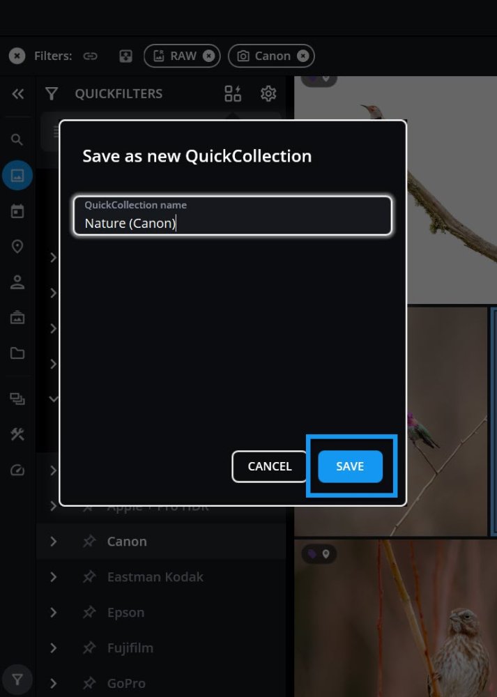 - Enter a name for your QuickCollection then click or tap the Save button.