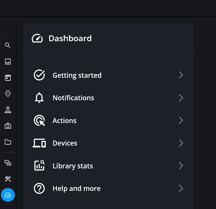 Actions | The Actions section displays shortcuts to common actions, including Add Media, Photo DeDupe, Add Device, Tag Faces, and Photo DeClutter along with any recommended actions, such as adding a Vault device to protect your photos or adding your first set of images. (Find Duplicate Photos and Find Similar Photos are available on computers and tablets only). |