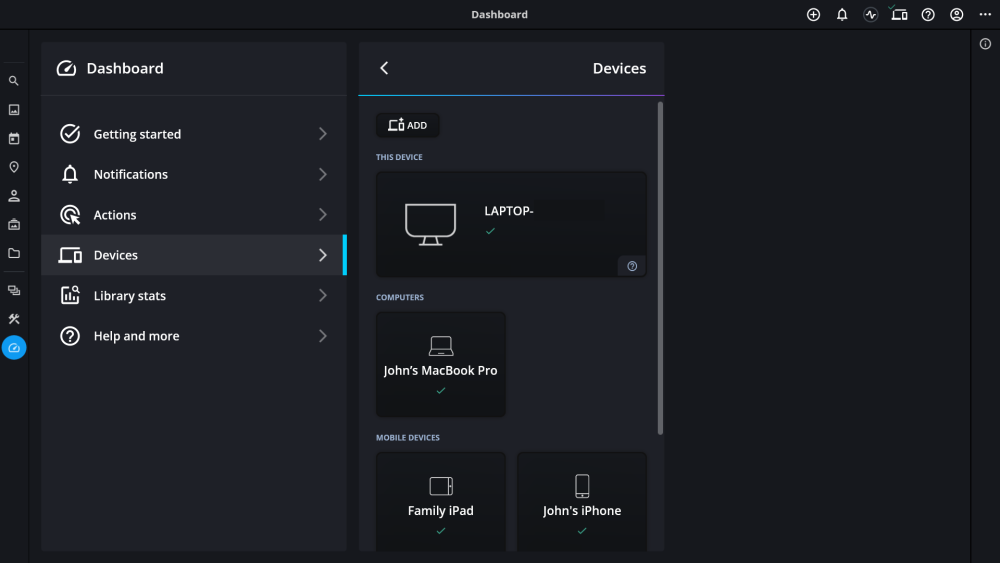 The Devices section of the Dashboard will show different information depending on the device card you select and whether you are currently using the selected device or managing settings for another device connected to your Mylio Photos+ Account.