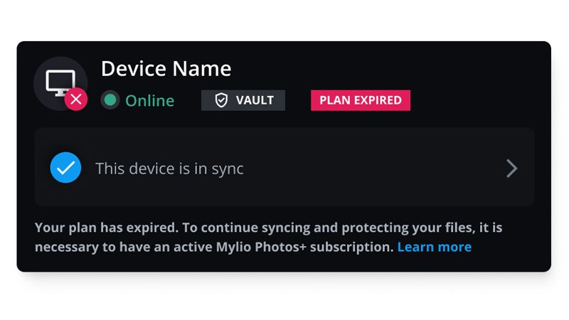 Syncing is paused because this device is attached to an account with an expired Mylio Photos+ subscription. To continue syncing, visit https://account.mylio.com to renew your subscription.