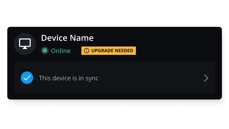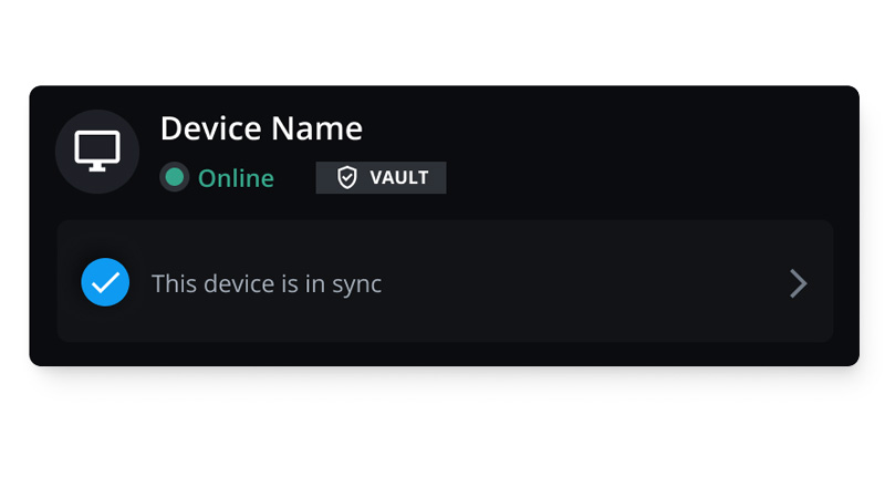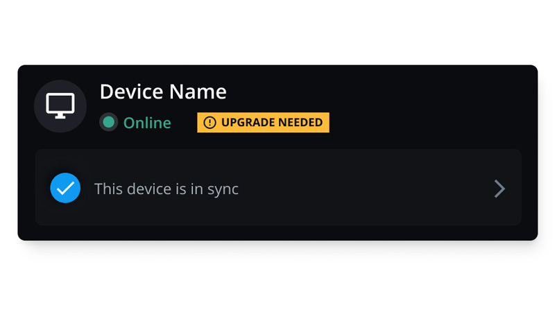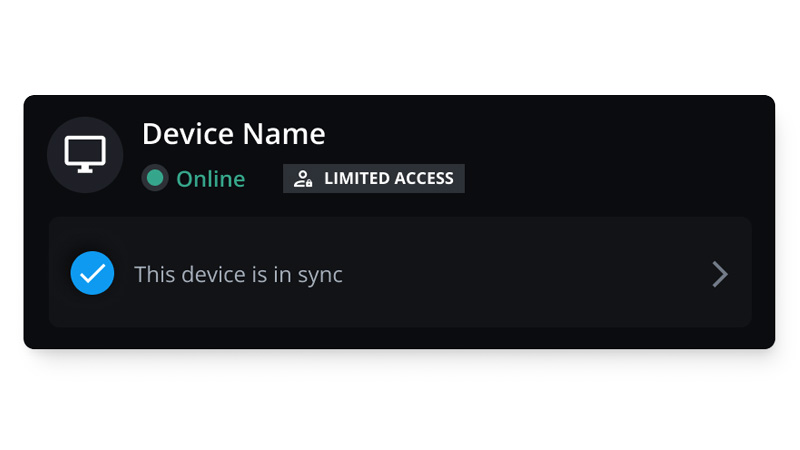 The lower portion of each device card shows the device’s current sync status. Clicking the caret opens the Syncing Details panel. Syncing Details provides a detailed breakdown of what still needs to sync.