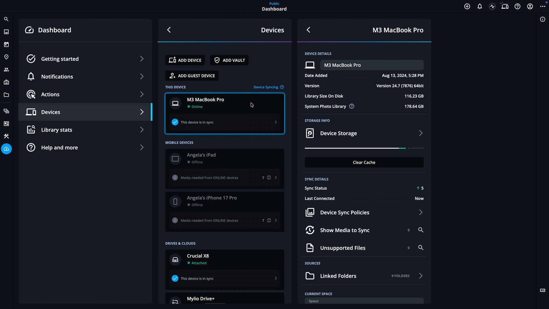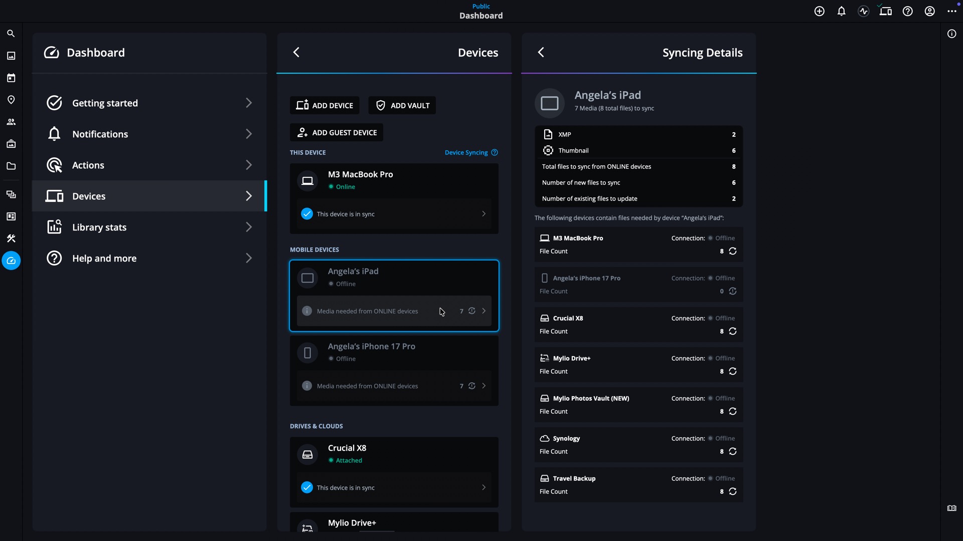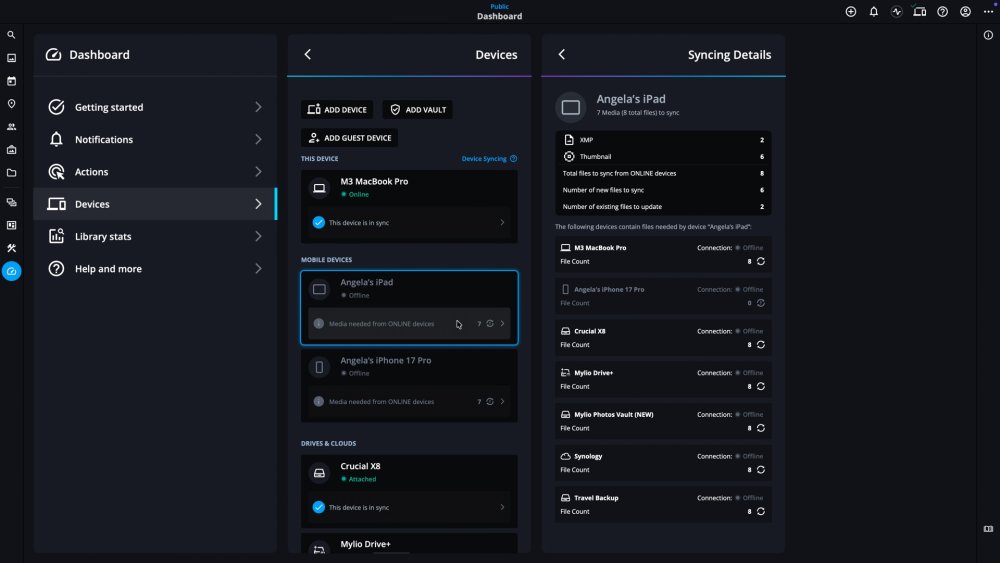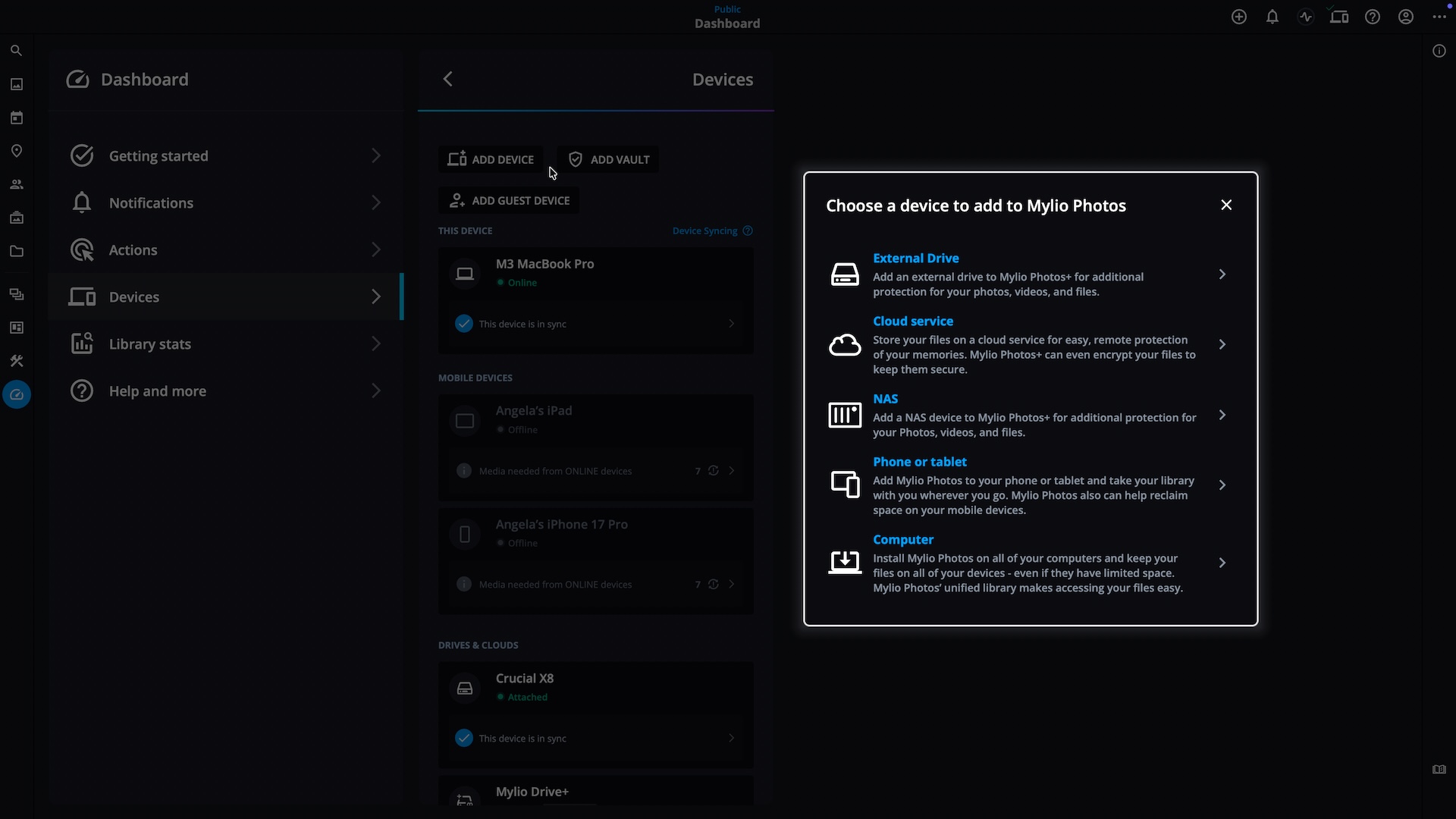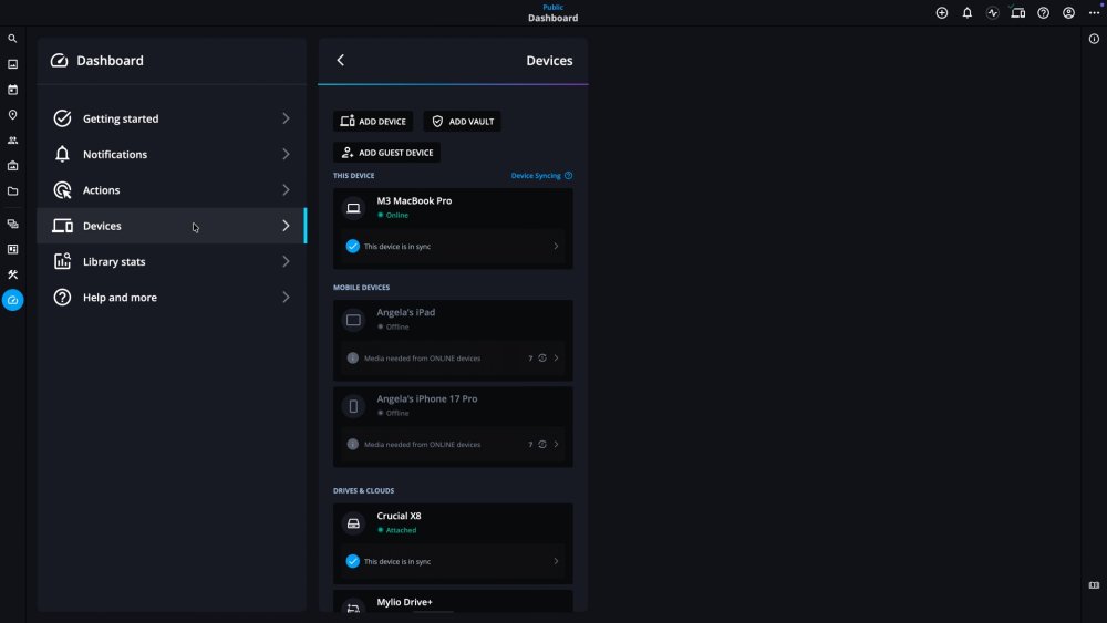 The Devices Panel in the Dashboard is where you see every device connected to your Mylio Photos account. From here, you can add new devices, review the status of existing devices, and remove devices that are no longer in use. This view is the central place for managing how your library is stored, synced, and protected across your system.