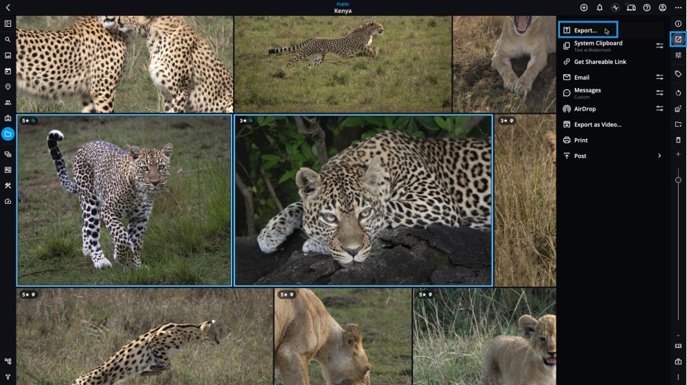 - Select the photo(s) you wish to export, click the Share icon