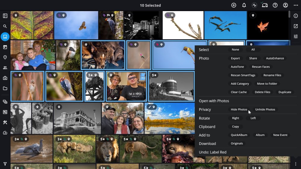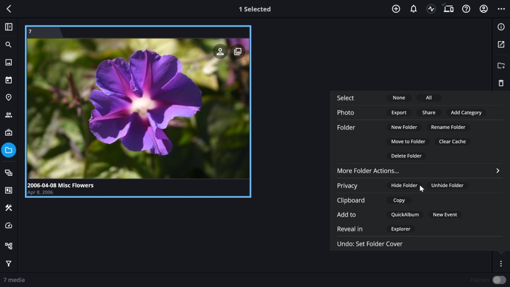 Mylio Photos provides flexible options to hide personal or sensitive media without deleting them. You can hide individual Files, entire Folders, Albums, or People using one of two methods:
