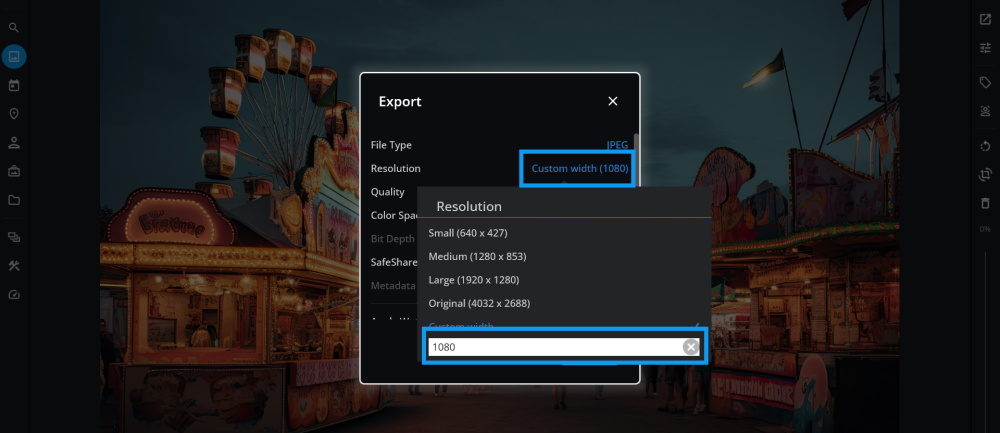 - Click on Resolution and enter a custom width of 1080.