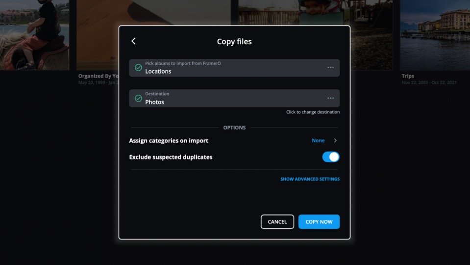 - Click Copy Now to download and import your Frame.io project or folder into your Mylio Photos Library.