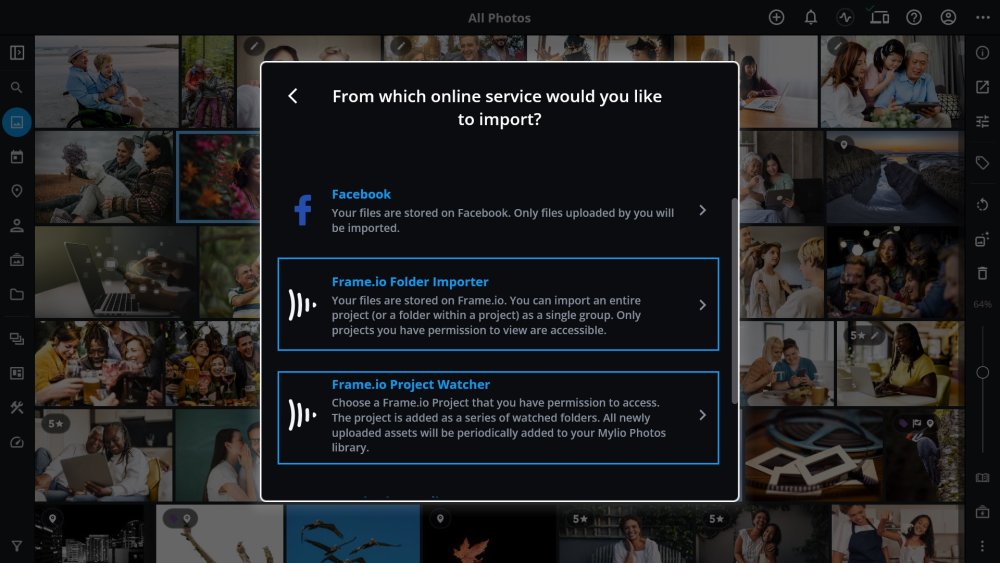 The Frame.io Project Watcher enables users to integrate a Frame.io Project into Mylio Photos as a collection of monitored folders. Media from this project will automatically populate your Mylio Photos Library, and any new media added to the Frame.io project will also be added with your Mylio Photos library.