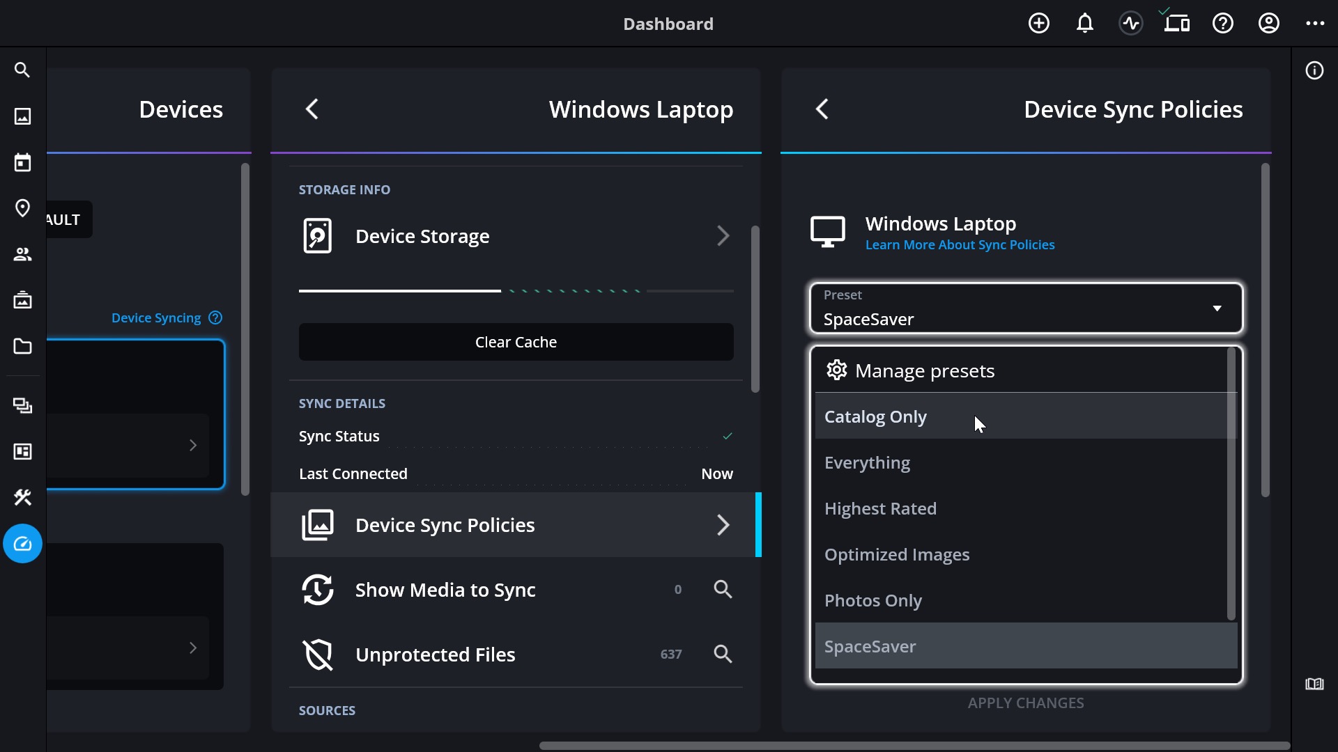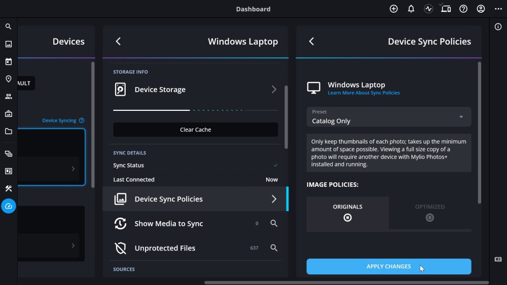 - After selecting a preset, click Apply Changes at the bottom of the panel. Mylio Photos will begin syncing the selected device based on the new preset.