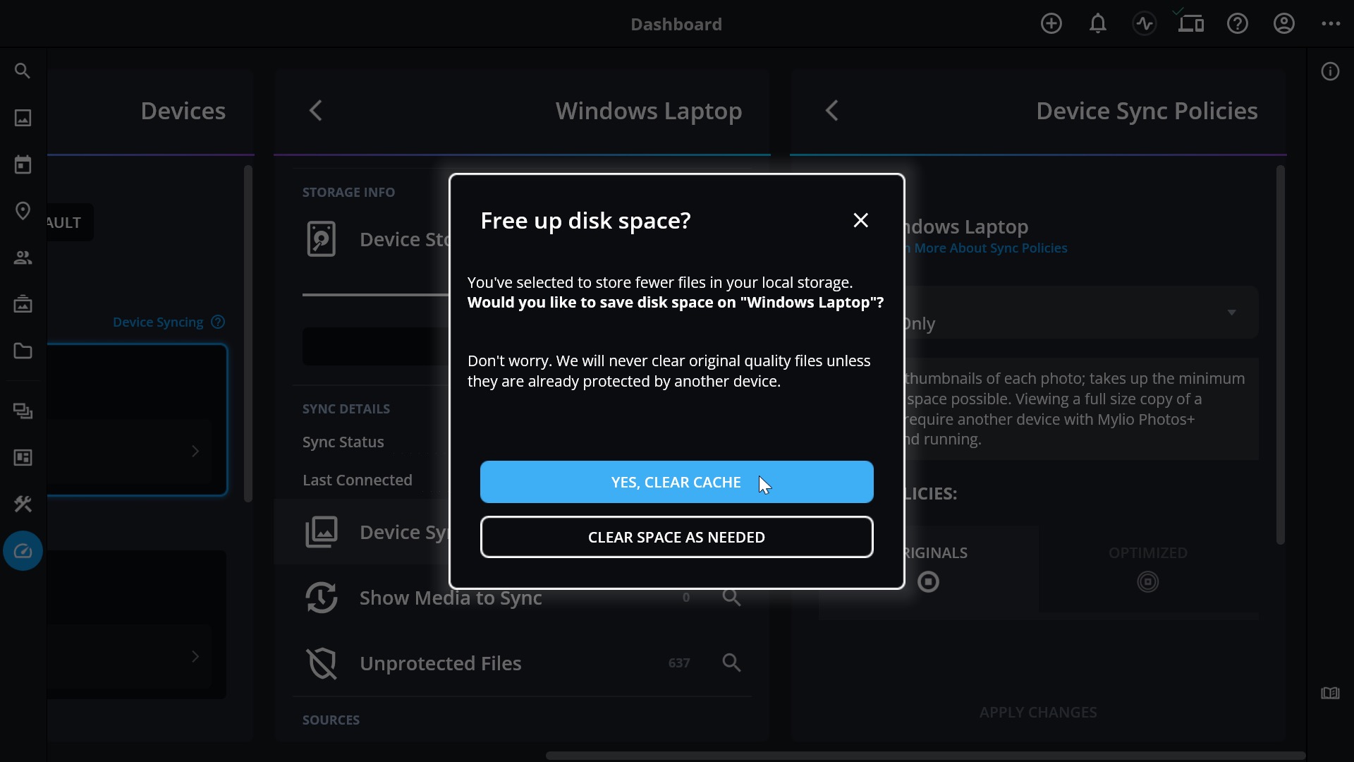 - If your new sync policy preset reduces the amount of storage used (for example, switching from SpaceSaver to Catalog Only), Mylio Photos will prompt you to clear cached files and free up space.