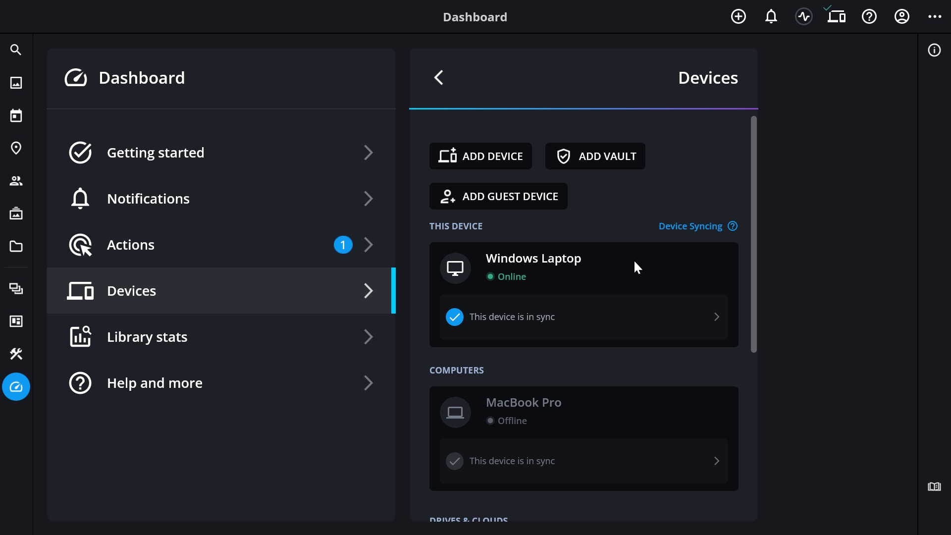 By default, computers and mobile devices (phones and tablets) are typically assigned the SpaceSaver preset. When you connect a storage device—like an external hard drive—Mylio Photos will assess its available storage and recommend a suitable sync policy preset, such as Vault or Travel Backup. You can change the sync policy for any device at any time in the Devices section of the Dashboard.