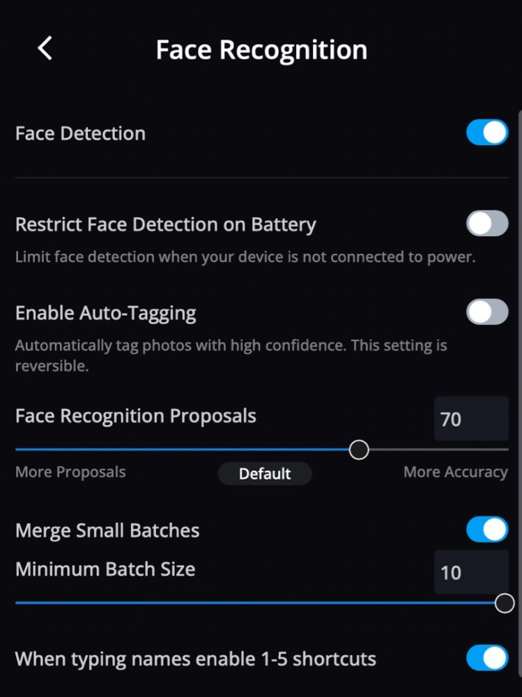- When typing names enable 1-5 shortcuts – Toggle this switch to enable or disable keyboard shortcuts when face tagging.
