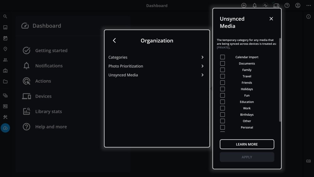 Unsynced Media – By default, Unsynced Media is marked as Private to prevent accidental sharing. Click to change the default behavior and apply different category settings during import.