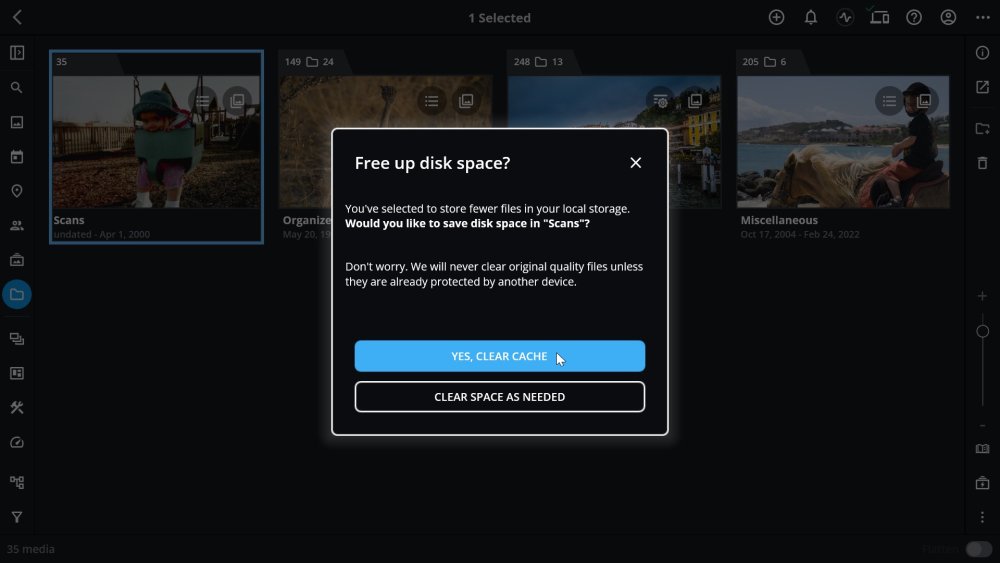 - If your new folder sync setting reduces the amount of local storage required (for example, changing from Originals to Optimized), Mylio Photos will prompt you with options to clear cached files and free up space. The options vary based on the selected sync policy:
