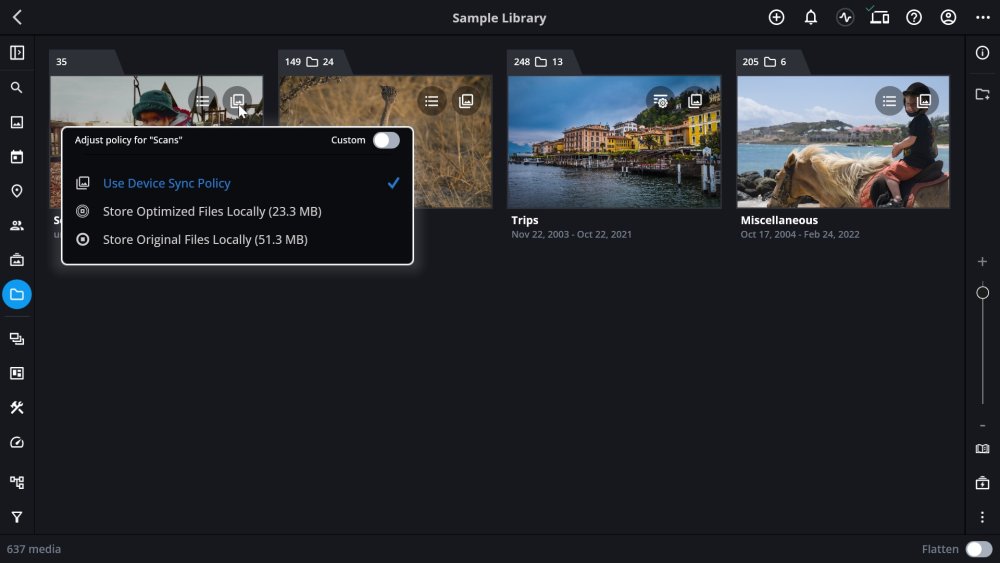 Tap to Sync gives you control over how individual folders are stored on each device, allowing you to override the device’s sync policy. This is especially useful when you want specific folders to be available offline in original or optimized quality—regardless of your default settings.