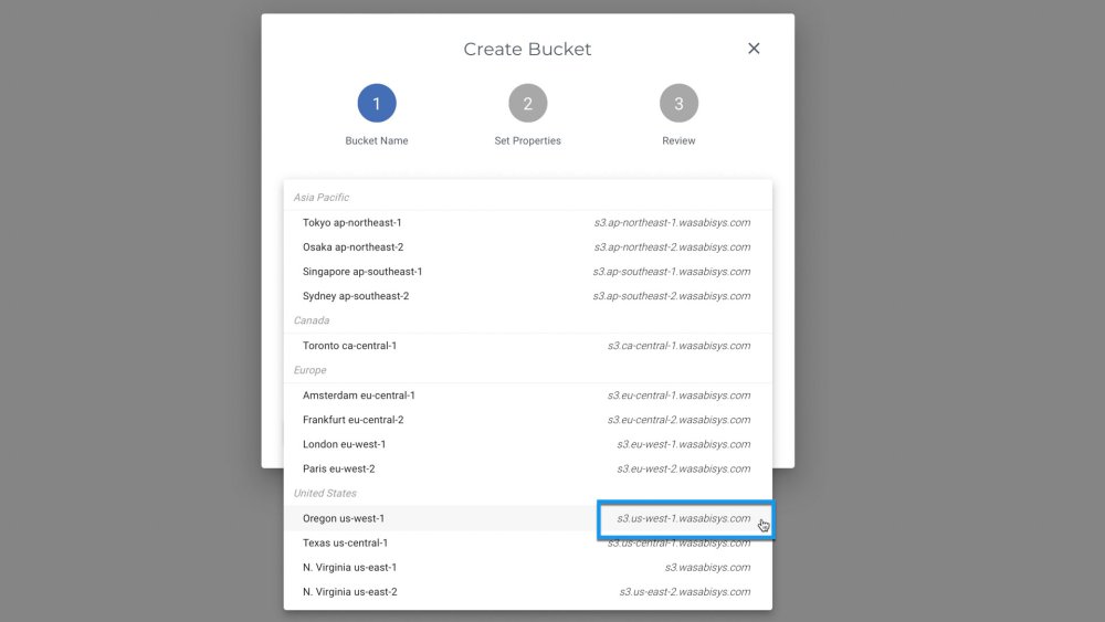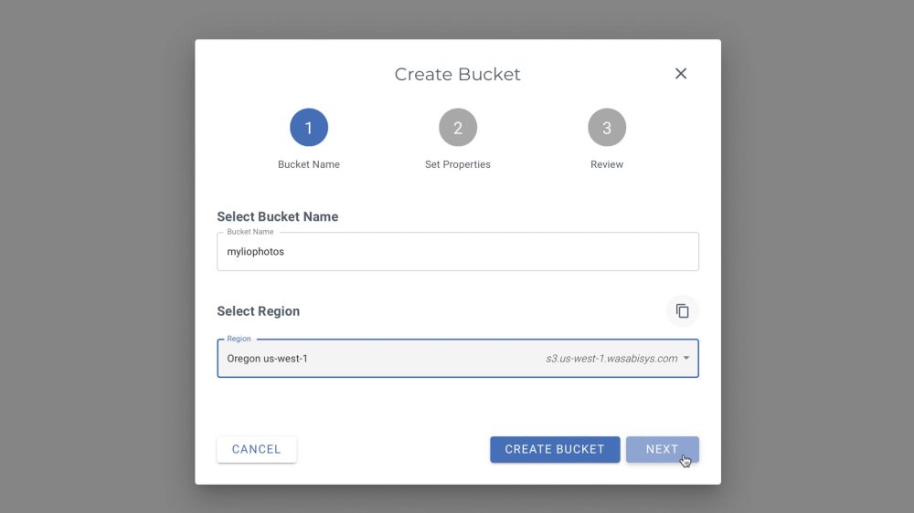 - Select a Region from the drop-down menu. Make a note of the Bucket Name and URL for your selected region in a safe place (e.g., a notes app or word processing document) for later use, then click NEXT.