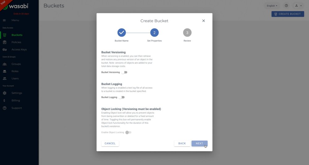 - Set Bucket Version and Bucket Logging to the OFF position, then click NEXT.