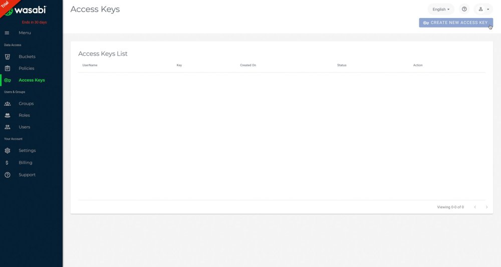 - Under Data Access, choose Access Keys, then click the button to Create New Access Key.