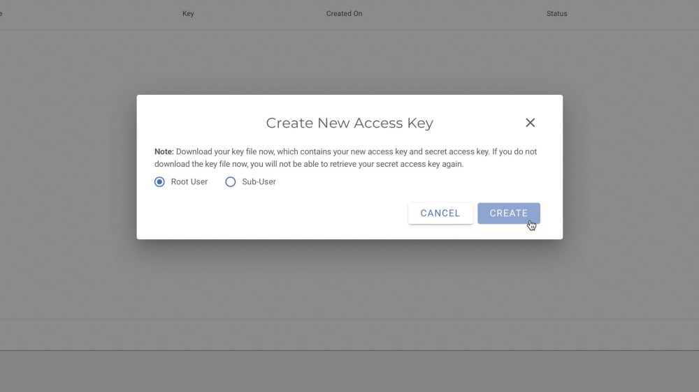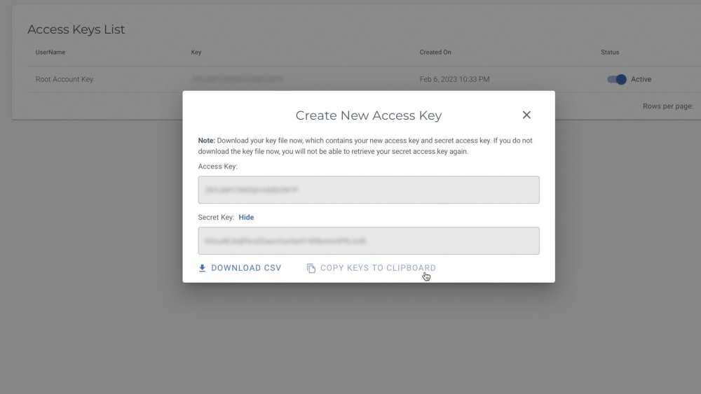 !WARNING: Be sure to copy your Access Key and Secret Key and paste the information into a safe place. This information cannot be retrieved after navigating away from this page.
