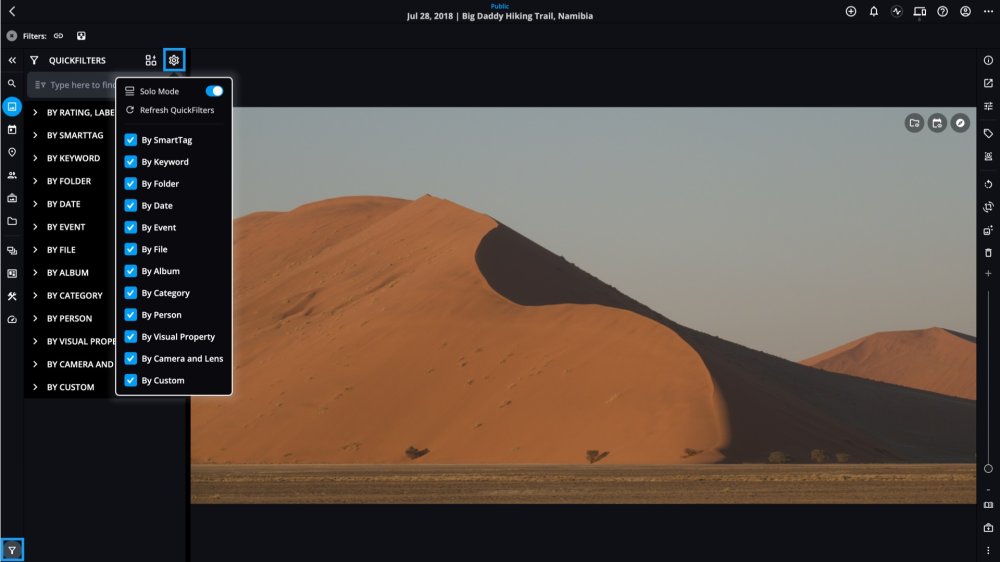 Mylio Photos offers various settings to help you customize your QuickFilters experience. You can choose which categories are displayed, activate Solo Mode for focused filtering, and refresh the QuickFilters list.
