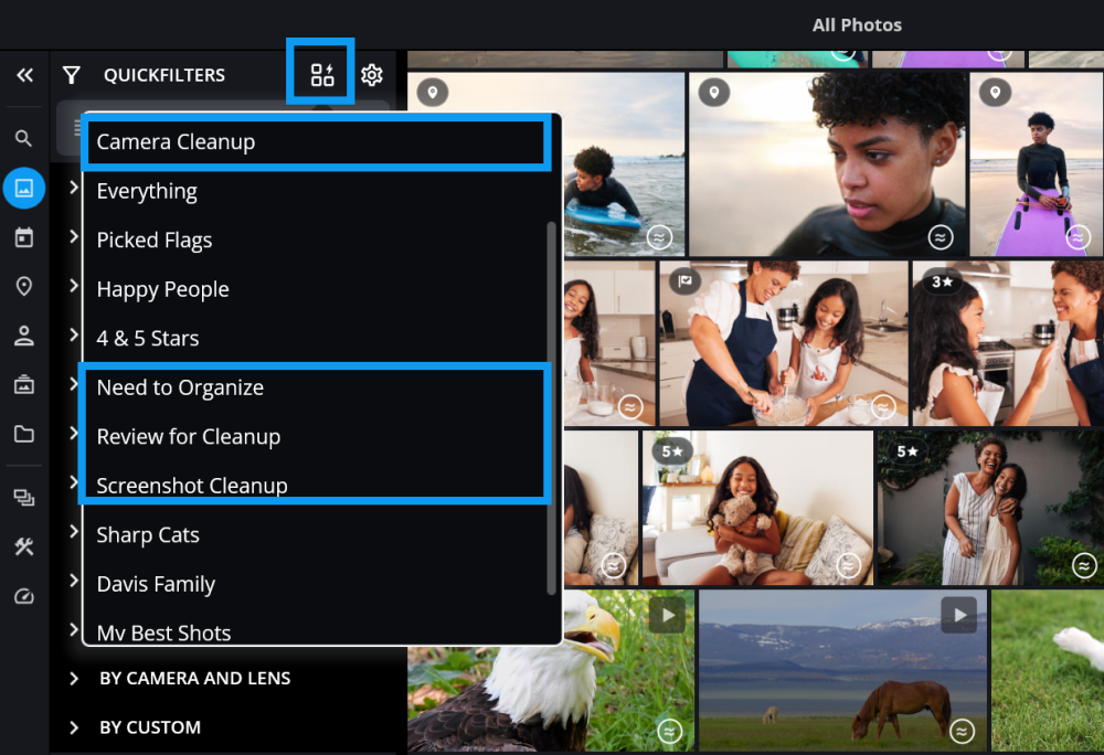 With the Camera Cleanup, Need to Organize, or Screenshot Cleanup options selected, launch QuickReview mode to sort the photos efficiently. QuickReview removes distractions and lets you focus on flagging or rating your images.