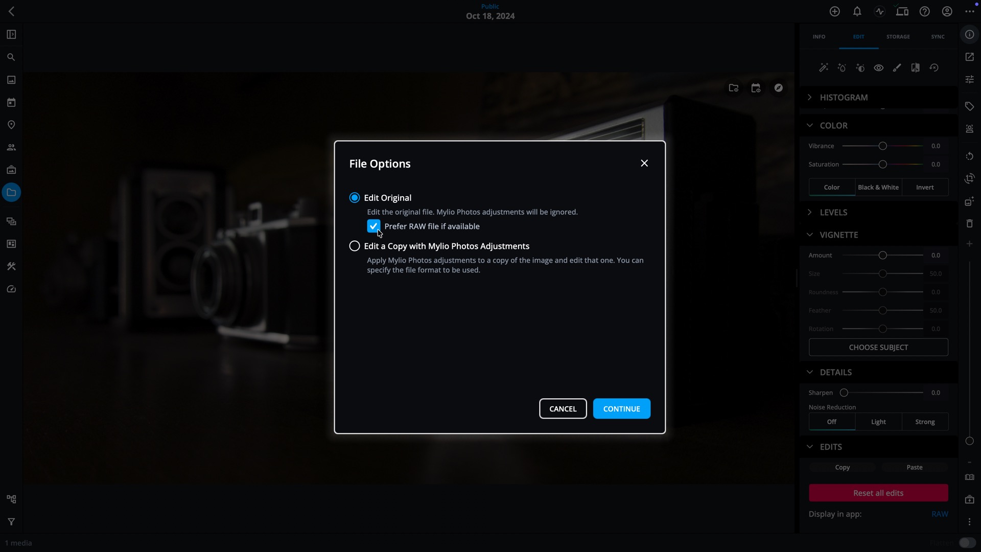 Mylio Photos will ask which version you want to edit: • Check Prefer RAW file if available to open the RAW file. • Uncheck it to open the JPEG/HEIF file.